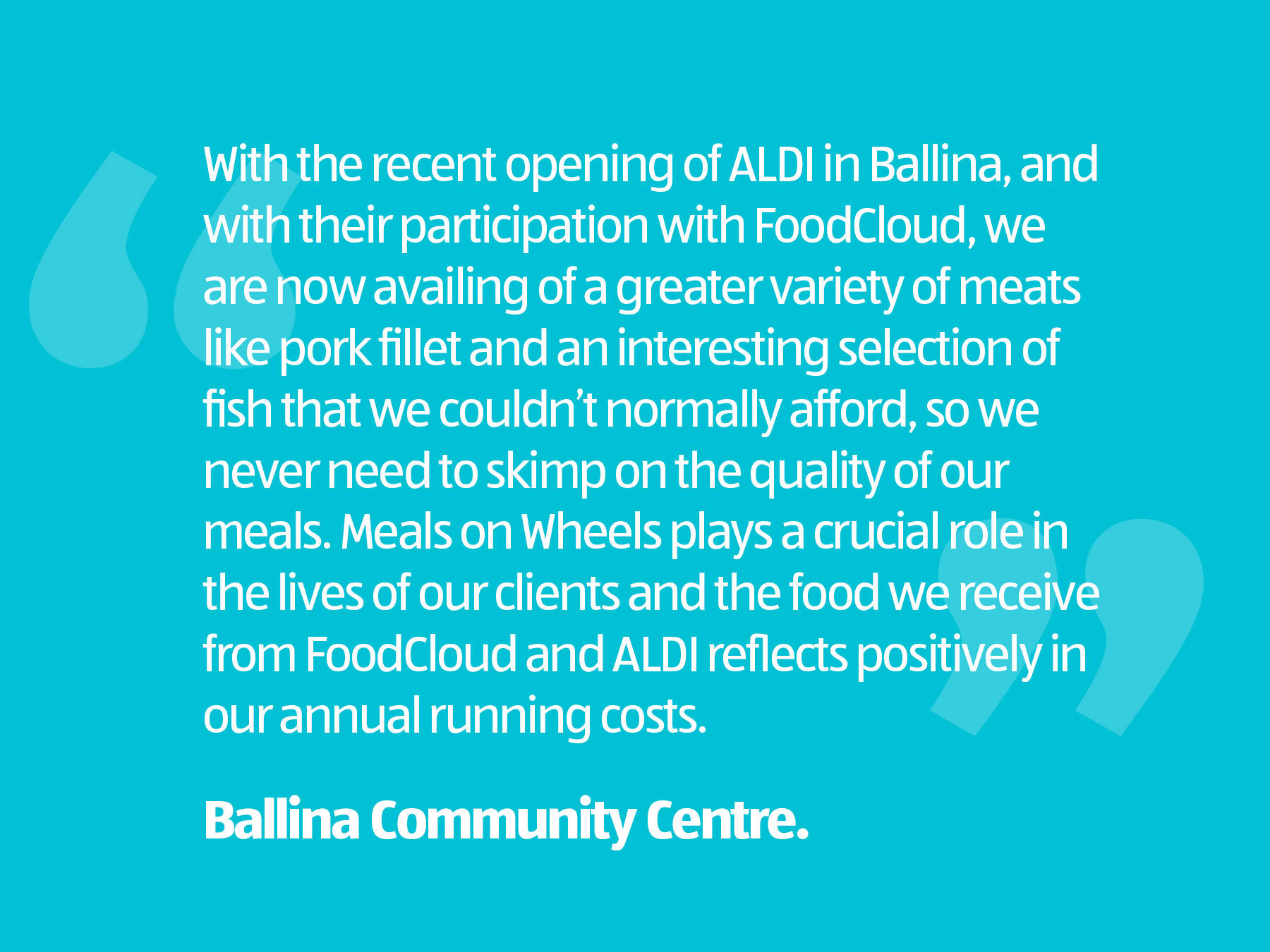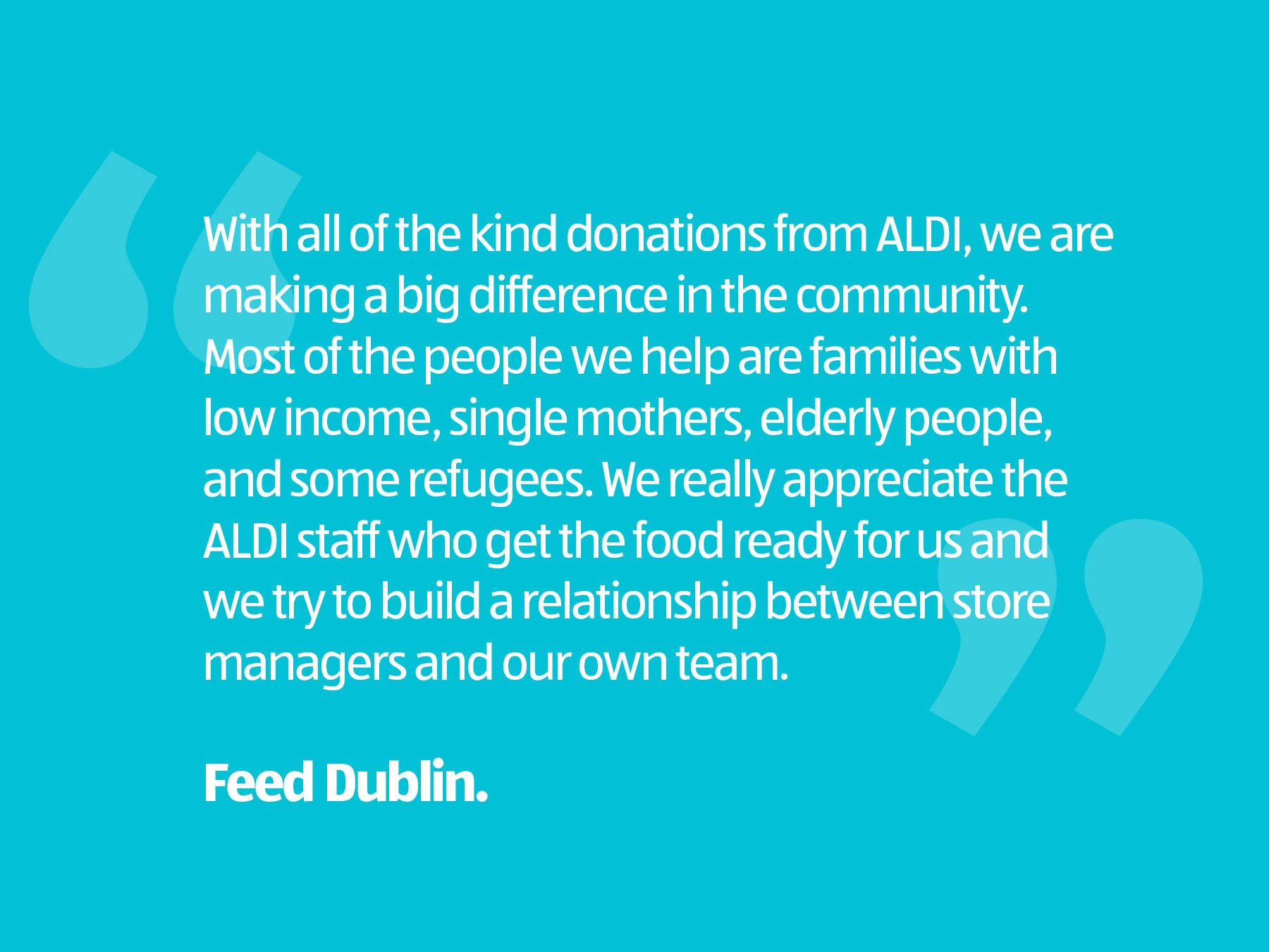 Aldi are proud partners of FoodCloud, a not-for-profit social enterprise working to reduce the environmental and social impacts of food waste. Through our partnership with FoodCloud, we donate consumable surplus food from all our stores to FoodCloud, who redistribute the food to charities and community organisations nationwide.