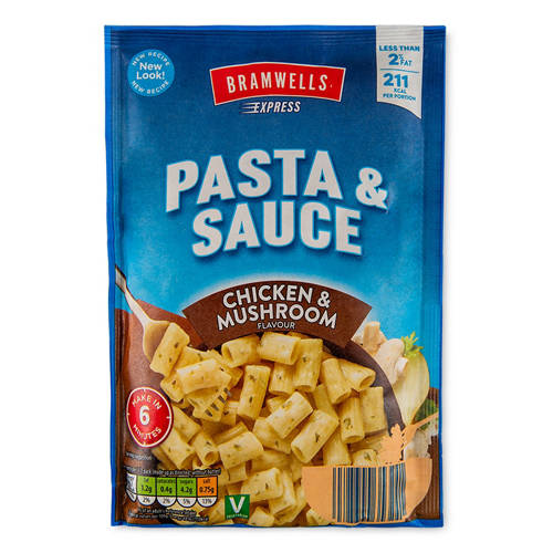 Dried pasta tubes in a chicken and mushroom flavour sauce mix