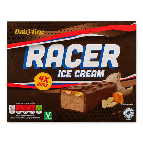 Peanut flavour dairy ice cream, caramel sauce and roasted salted peanuts with a cocoa coating