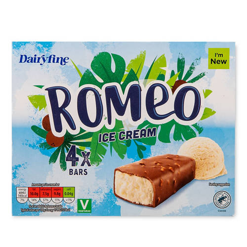 Coconut flavour dairy ice cream, with desiccated coconut pieces, covered with a cocoa coating and caramelised coconut pieces
