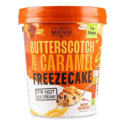 Frozen butterscotch flavoured cheesecake with caramel flavoured sauce and biscuit pieces coated in chocolate, topped with caramel pieces.