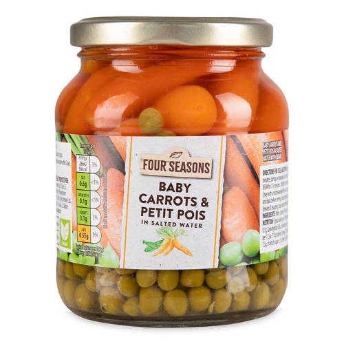 Carrots and petit pois in salted water with sugar.