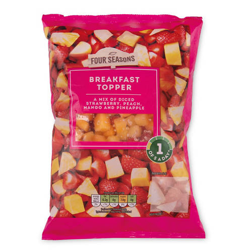 - A mix of diced strawberry, peach, mango and pineapple.