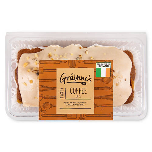 Coffee flavoured cake topped with a coffee flavour frosting and sprinkled with nibbed walnuts.