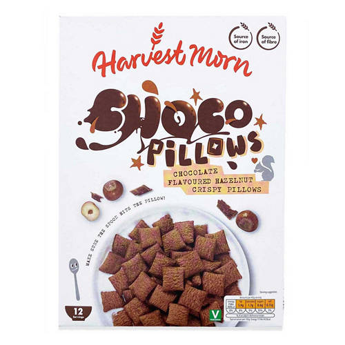 Chocolate flavoured wheat, maize and rice cereal pillows with a chocolate flavoured and hazelnut filling.