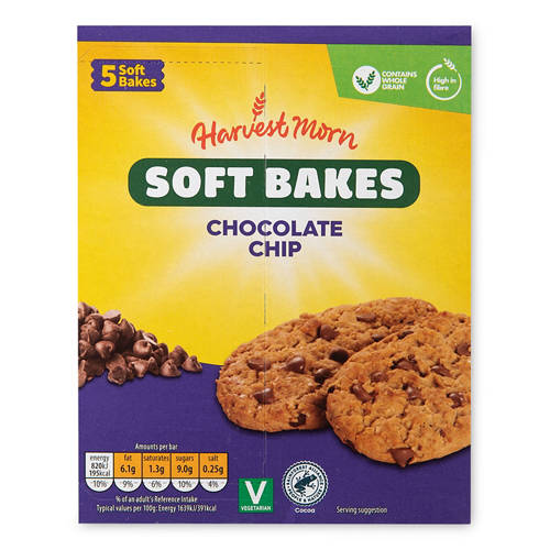 5 Individually wrapped packs of soft biscuits made with wholegrain cereal with chocolate chips. No artificial colours, flavourings or preservatives.