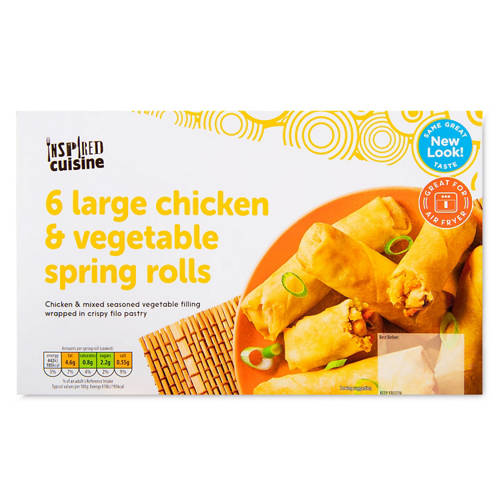 Cooked cabbage, marinated chicken breast pieces, bean sprouts, carrot, green pepper, onion and shiitake mushrooms in an oriental style sauce, wrapped in filo pastry.
