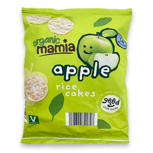 Puffed organic mini rice cakes with added apple juice from concentrate.