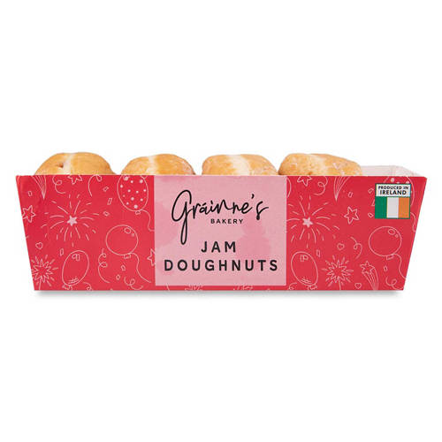 4 doughnuts with a raspberry flavour apple jam filling, dusted with sugar