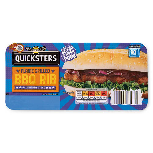- Chopped and shaped smoke flavour pork ribsteak with added textured soya protein in a sesame seeded bun, with a sachet of barbecue sauce.