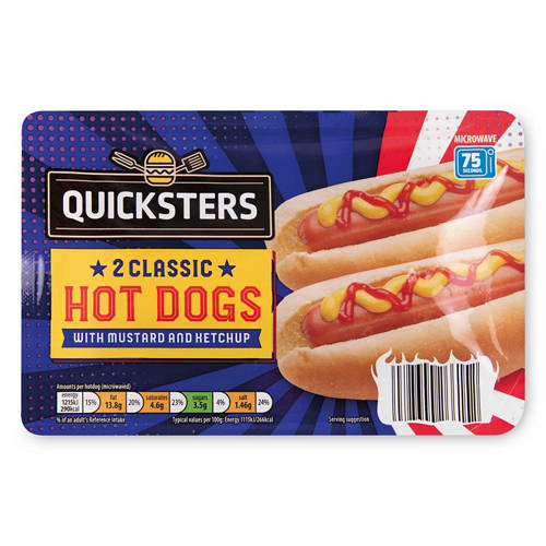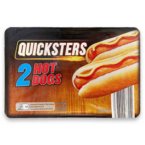 Two pork sausages in white buns with separate sachets of ketchup and mustard.