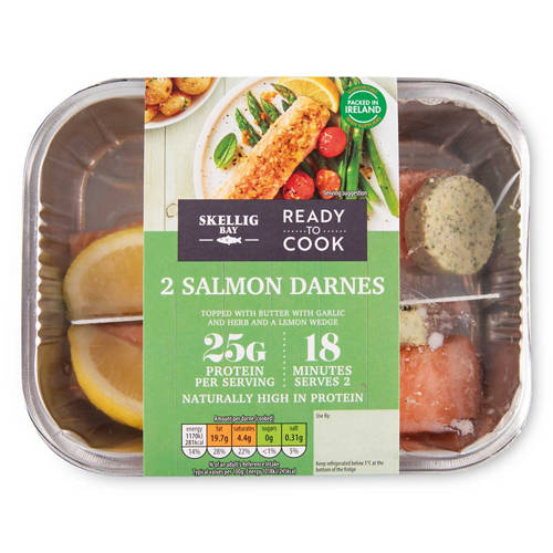 2 Salmon Darnes topped with butter, garlic & herbs.