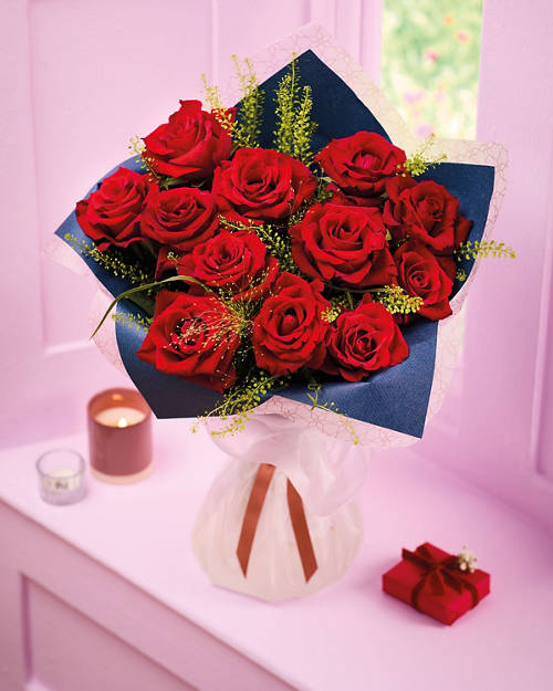- A bouquet of premium red roses mixed with green bell and panicum fountain, a delightful mix to captivate anyone's heart.