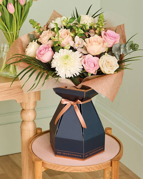 Make a grand statement this Mother’s Day with this spectacular arrangement featuring a Cymbidium Orchid, premium white, pink and peach Roses, pink Alstroemeria and Snapdragons, dainty Astrantia, and striking white Magnum blooms. All complemented by lush foliage like Panicum grass, Eucalyptus and Palm Leaf.