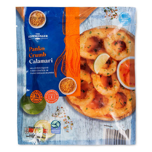 Pre-fried squid rings, coated in panko breadcrumbs with sweetener. Cooks from frozen in 14 minutes.