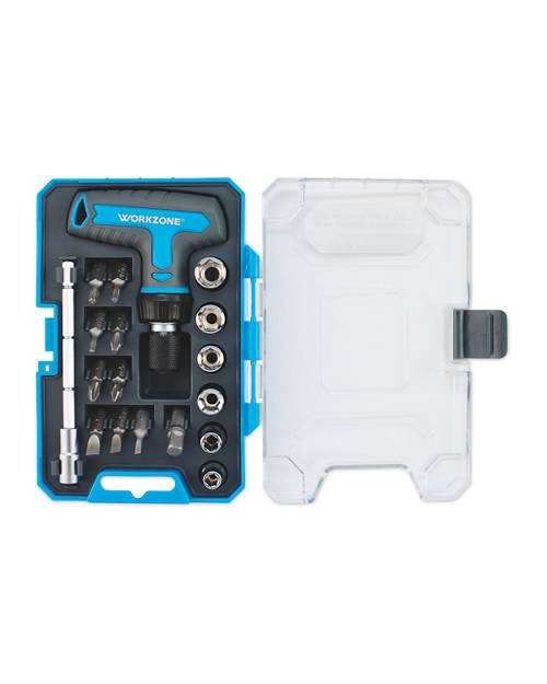 • Choose from 22 piece Ratchet Screwdriver and Bit Set, 18 piece Ratchet T-handle Screwdriver and Bit Set or 23 piece Ratchet Wrench and Screwdriver Bit Set