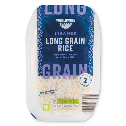 Steamed long grain rice. Perfectly fluffy rice in 2 minutes - microwave or stir fry. Caution: Beware of escaping steam when removing film. Handle carefully to avoid scalding.No artificial colours, artificial flavourings or artificial preservatives