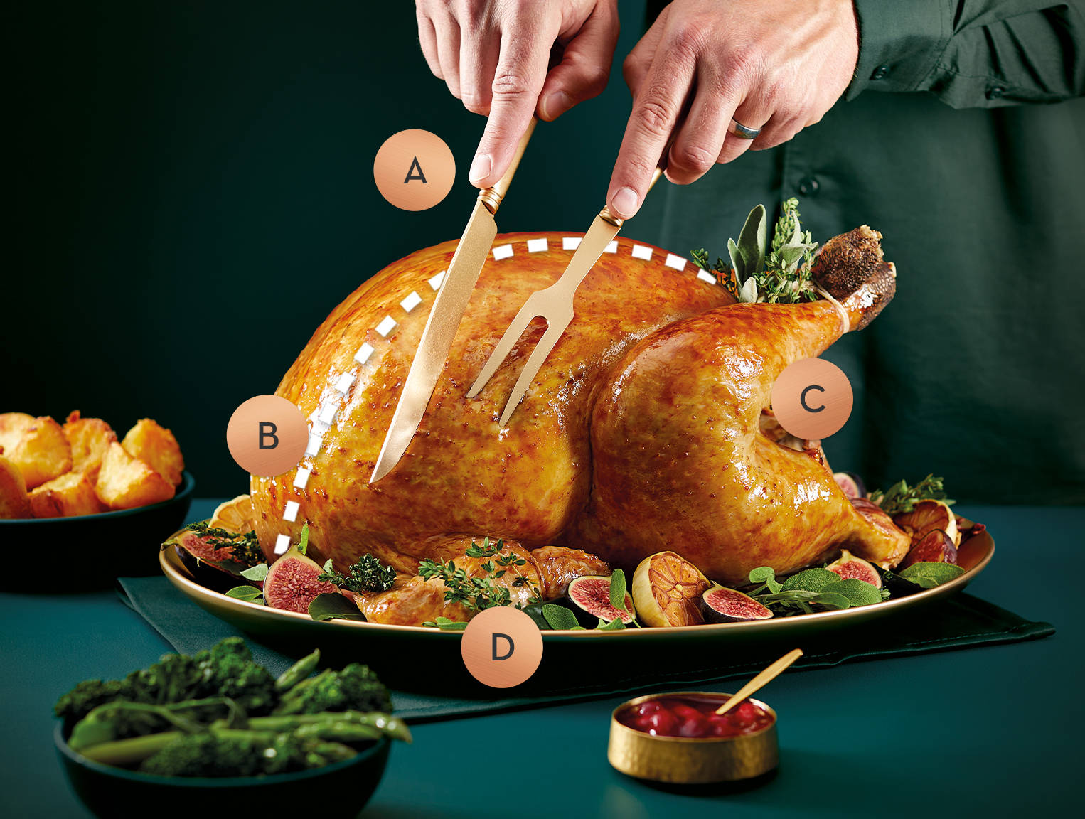 A) Sharpen your turkey carving knife and carve away the legs by gently pulling them away from the turkey where a gap will appear - cut down through the joint to remove.